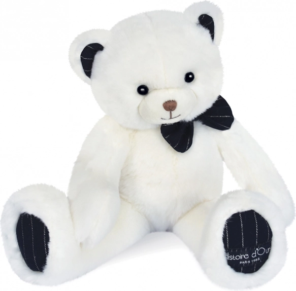 Roztomilý a mäkučký plyšový medvedík v farbe slonovinovej kosti s tmavomodrým pruhovaným motýlikom je ideálny prvý kamarát do postieľky aj dekorácia detskej izbičky. Je vyrobený z prémiového, hebkého plyšu, spĺňa európske normy CE a je vhodný od narodenia. Súčasťou je krásna darčeková krabička, vďaka ktorej je skvelým darčekom na Vianoce či k narodeniu bábätka.