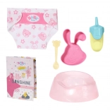 - Bohaté príslušenstvo: fľaštička, cumlík na stužke, plienka, tanierik, lyžička, nočník a ďalšie doplnky na hru na starostlivosť.