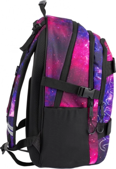 Objavte perfektnú kombináciu funkčnosti a štýlu. Školský set BAAGL Skate Galaxy prináša odolný batoh s trojkomorovým usporiadaním, organizérom a polstrovaným vreckom na 15" notebook či tablet. Ergonomicky tvarovaný chrbát, plne nastaviteľné ramenné, hrudné a bočné kompresné popruhy zaistia zdravé a pohodlné nosenie po celý deň. Predné popruhy slúžia na uchytenie skateboardu, bočné elastické vrecká pojmú fľašu na pitie a reflexné prvky zvyšujú viditeľnosť.