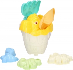 - Vedierko, viečko so sitom, 3× formička dinosaura, hrable, lopatka
