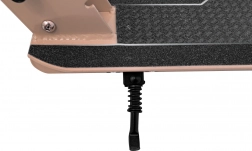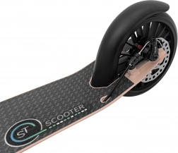 Bezpečie máte pevne v rukách: kombinácia ručnej kotúčovej brzdy a zadnej nášľapnej brzdy poskytuje isté a rýchle zastavenie. Kaučukové kolesá 190 × 35 mm výborne tlmia drobné nerovnosti a protišmykový povrch dosky drží nohu aj za mokra. Nechýba stojan na pohodlné odstavenie.