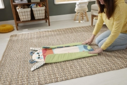 Podložka je vyrobená z látky obsahujúcej 90 % recyklovaného plastu a dodáva sa v obale s certifikáciou FSC. Vďaka šikovnému riešeniu ju jednoducho zrolujete, zaistíte „lapičkami“ a vezmete so sebou na cesty. Odnímateľné hračky ľahko pripnete na pútka, takže je hranie vždy nové a podnetné.