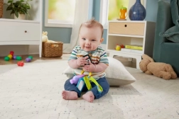Zrkadielko pre sebauvedomenie, stláčacia fľaštička pre hmat a textúrované hryzátko pre pohodlie pri prerezávaní zúbkov.