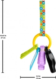 Každý prívesok na krúžku prináša iný vnem: hudobný kľúč spúšťa zvuky vozidiel, pesničky a vety, stláčacia fľaštička podporuje hmatové vnímanie, zrkadielko láka k sebapoznávaniu a hryzátko s textúrou uľavuje pri prerezávaní zúbkov. Vďaka ľahkej konštrukcii je hračka ideálna do kočíka, auta aj na domáce hranie.