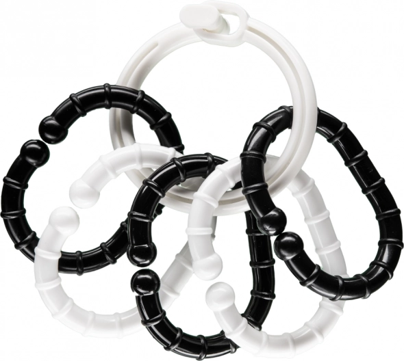 Kontrastné čiernobiele krúžky s príveskami podporujú rozvoj zraku a jemnej motoriky už od narodenia. Sú z kvalitného plastu a silikónu, vhodné od 0+ a testované podľa EN 71 (časti 1–3 a 9) na bezpečné každodenné používanie.