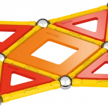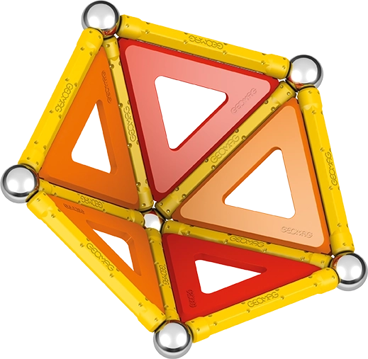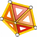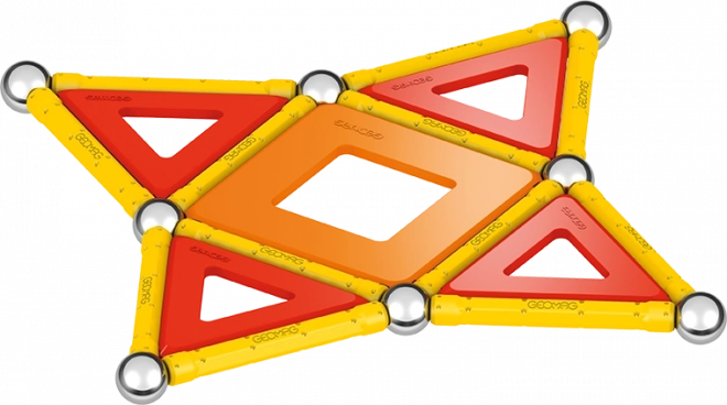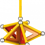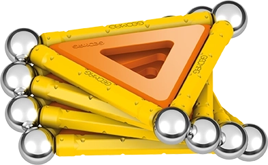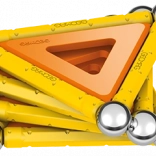 Čo nájdete v balení: 12 žltých magnetických tyčiniek, 12 oceľových guľôčok, 8 trojuholníkových výplní, 2 štvorcové výplne, 1 oranžovú výplň v tvare päťuholníka a plastový box na guľôčky a tyčinky.