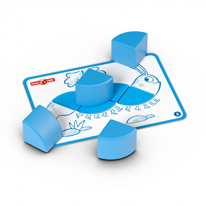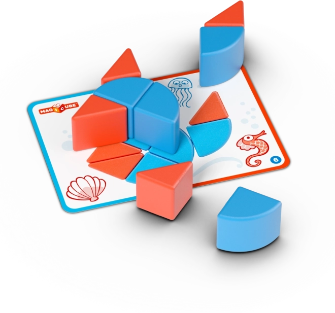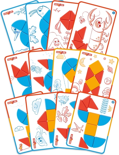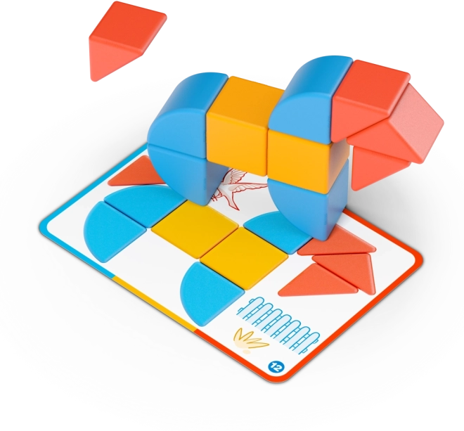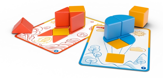 Súčasťou je 6 obojstranných kariet s 12 úlohami, ktoré vedú od jednoduchých skladačiek k pokročilejším tvarom a podnecujú logické myslenie.