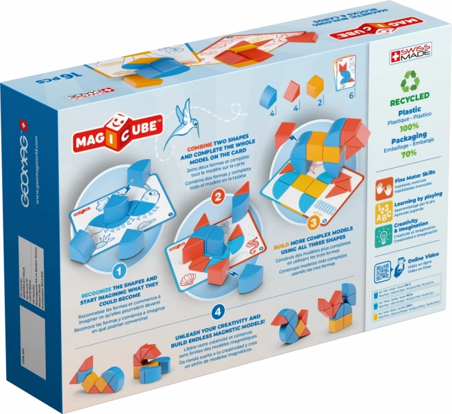 Geomag Magicube Shapes prináša deťom hravou formou spoznávanie tvarov a konštrukcie. Vďaka chytrej magnetickej technológii sa diely k sebe priťahujú z rôznych strán, takže stavanie je intuitívne, zábavné a motivujúce na ďalšie objavovanie. Súčasťou balenia sú obojstranné karty s nápadmi, ktoré krok za krokom vedú od jednoduchých obrázkov až po zložitejšie projekty.