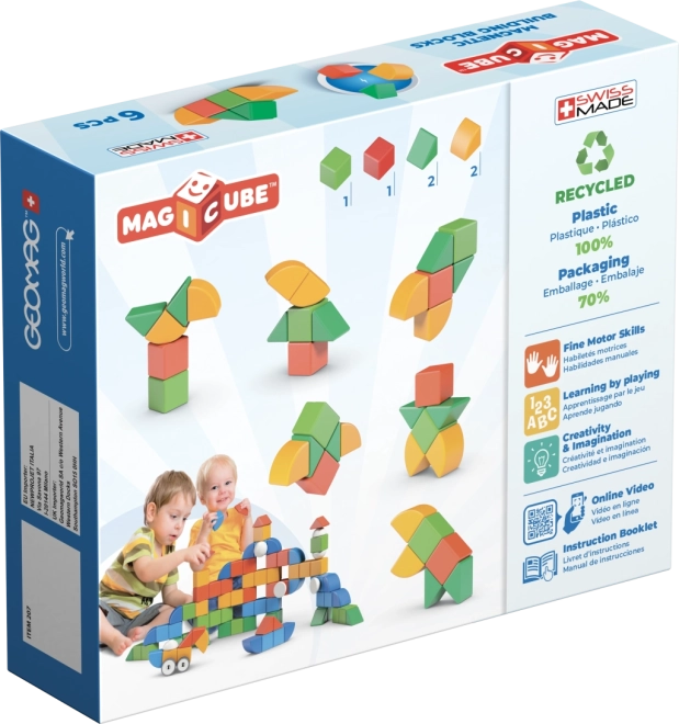 GEOMAG Magicube Shapes je šikovná magnetická stavebnica navrhnutá špeciálne pre najmenšie deti. Vďaka pevným magnetom sa dieliky k sebe jednoducho prichytávajú zo všetkých strán, takže sa ľahko stavajú prvé vežičky, zvieratká či jednoduché objekty. Deti si pritom prirodzene rozvíjajú koordináciu oko–ruka a učia sa základným tvarom a farbám.