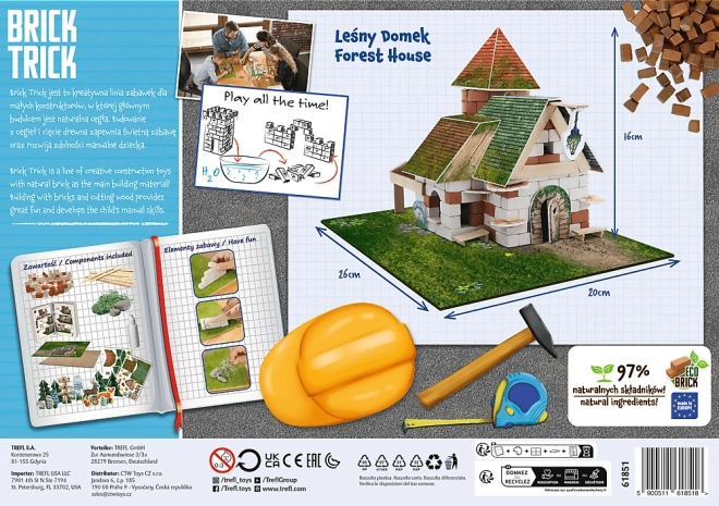 Postavte lesný domček zo skutočných tehál a dekoratívnych prvkov. S produktmi Brick Trick sa zoznámite s niektorými populárnymi a obľúbenými pamiatkami a hlavne získate možnosť postaviť si ich od základov. Ukladajte tehlu za tehlou, režte a lepte dosky, postupujte od základov až po dokončenú budovu a nakoniec svoj výtvor ozdobte priloženými dekoráciami. Stavajte krok za krokom podľa návodu alebo nájdite a zrealizujte svoje vlastné riešenie. Oživte svoju dokončenú stavbu papierovými figúrkami. Ak spojíte niekoľko sád TREFL Brick Trick, môžete vytvoriť malebnú dedinku, moderné mesto alebo stredoveké osídlenie. Stavebnicu možno používať opakovane (lepidlo je rozpustné vo vode). Úroveň náročnosti: 3,5 Balenie obsahuje: - viac než 220 prírodných hlinených tehličiek - drevené dosky - základovú dosku - ozdobné prvky - samolepku - lepidlo - obrázkový návod Stavebnice Brick Trick od výrobcu TREFL zlepšujú zručnosť, rozvíjajú predstavivosť a podporujú sústredenie.