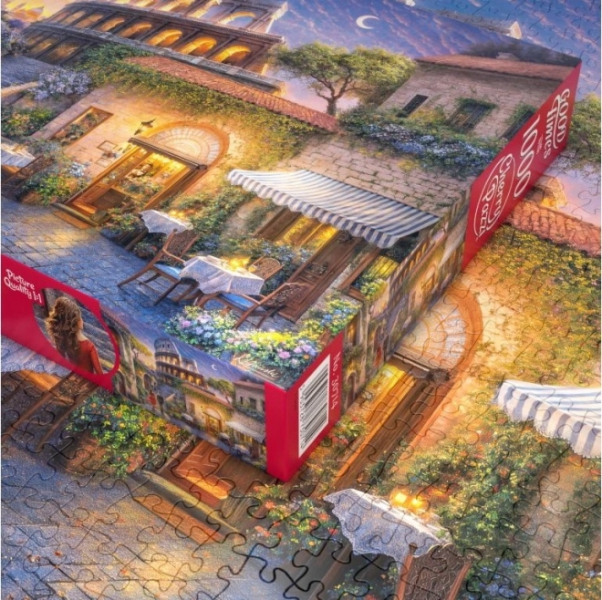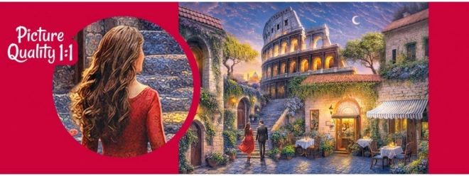 Zažite jedinečnú atmosféru večerného Ríma prostredníctvom tejto 1000-dielnej skladačky od CherryPazzi s romantickým obrazom zamilovaného páru, ktorý kráča k osvetlenému Koloseu. Tento obraz je ideálny pre každého milovníka Ríma a romantiky.