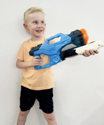 Odolné plastové prevedenie, ergonomická rukoväť a spúšť s plynulým chodom zabezpečujú pohodlné a bezpečné použitie. Futuristický dizajn v modro‑čiernom prevedení osloví malých aj veľkých bojovníkov a podporí aktívny pohyb na čerstvom vzduchu.