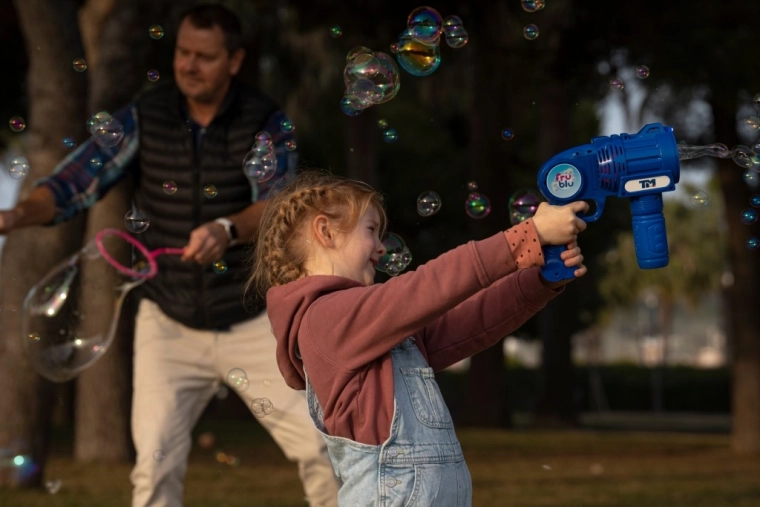 Striekačka na bubliny Fru Blu vystreľuje vysokou rýchlosťou obrovské množstvo bublín a poskytuje vášmu dieťaťu hodiny zábavy. Bubliny sú osvetlené LED svetlom, ktoré zvýrazňuje ich jedinečné farby. Vďaka jednoduchému používaniu a nádobke na tekutinu odolnej proti rozliatiu je fúkanie bublín skvelou aktivitou pre staršie aj mladšie deti. Sada obsahuje hračku na vystreľovanie bublín a 0,4-litrovú fľašu s tekutinou. Vyžadujú sa batérie: Potrebné batérie: 3 × AA. Batérie nie sú súčasťou balenia. Hračka je vhodná pre deti staršie ako 3 roky.