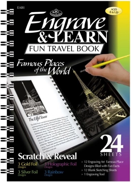 Objavte kreatívnu zábavu pre deti aj dospelých: tento blok ponúka 12 škrabacích obrázkov so slávnymi miestami sveta, doplnených o anglické popisky na nenásilné učenie. Čierna vrstva ukrýva zlatý, strieborný, dúhový a holografický podklad a súčasťou je aj plastové škrabacie pero s kovovým hrotom a 12 čistých listov na vlastnú tvorbu. Ideálne na cesty a ako darček.