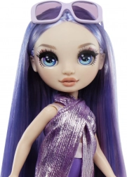 Bábika má dlhé fialové vlasy, ktoré sa skvele hodia k jej veľkým modrým očiam. Štýlový lesklý outfit spolu s fialovými slnečnými okuliariami prináša módnu tému do hry.
