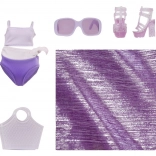 Príslušenstvo zahŕňa fialové oblečenie, slnečné okuliare, topánky a malú kabelku, čo umožňuje rôzne módne variácie a témy ako je pláž či leto.