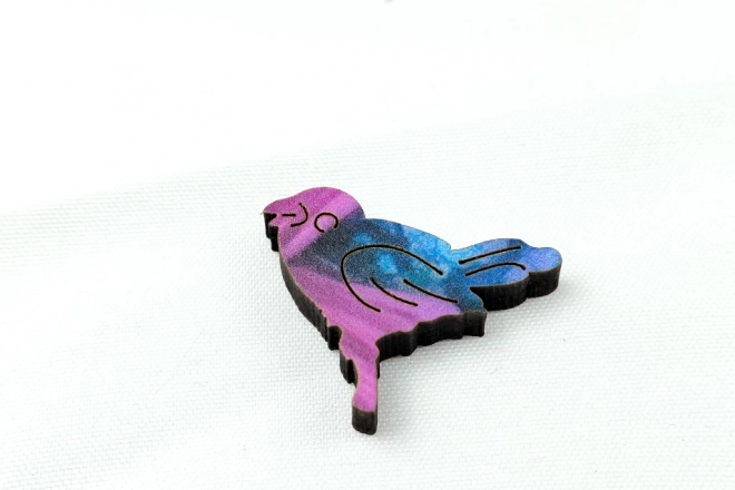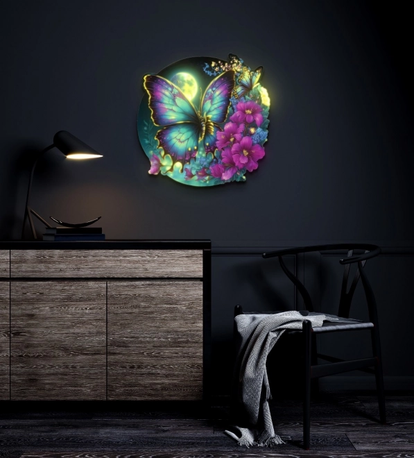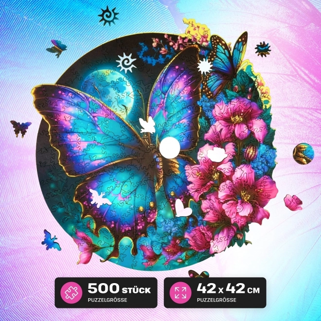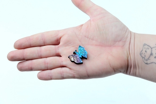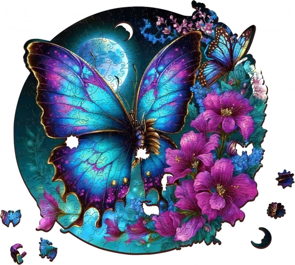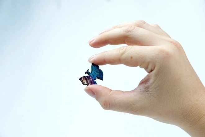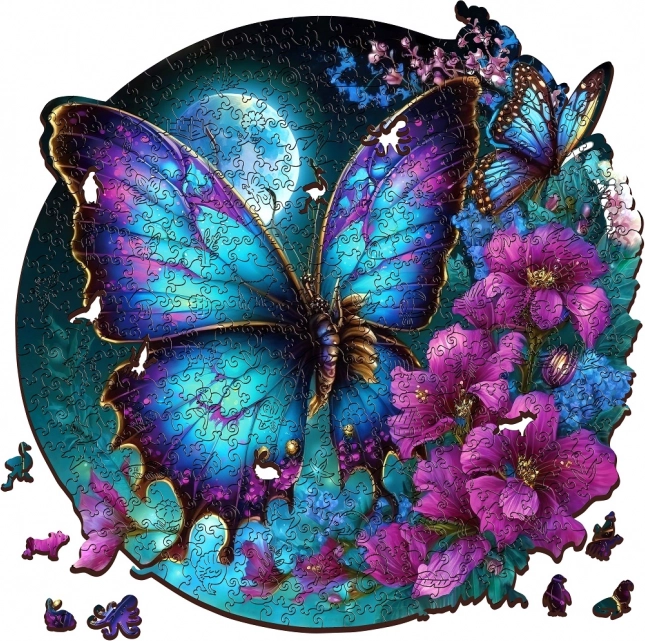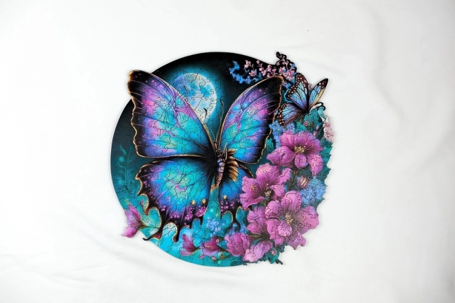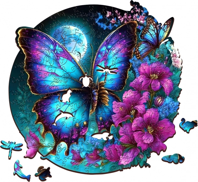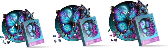Toto okrúhle drevené puzzle s pôsobivým motívom modrofialového motýľa prináša dokonale ostré farby vďaka UV digitálnej tlači a precíznemu remeselnému spracovaniu. Každý dielik je unikátny, hladký na dotyk a presne sedí, čo zaisťuje príjemné a plynulé skladanie. S priemerom 42 cm sa hotové puzzle stane nápaditou nástennou dekoráciou.