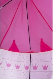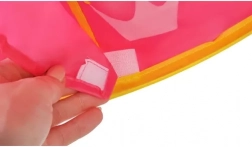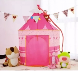 Ružový motív s korunkami, dve sieťované okienka a vstup na suchý zips vytvárajú útulné a vetrané miesto na hranie. Priestor pojme aj viac detí naraz.