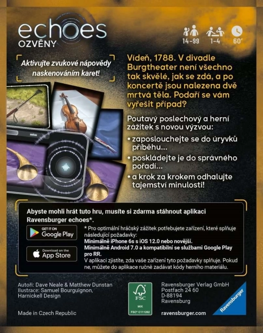 Vstúpte do temnej Viedne roku 1788 a odhaľte, čo sa stalo po koncerte v Burgtheatri. Echoes: Husle je napínavá detektívna audiovka, ktorá prepája fyzické karty s mobilnou aplikáciou a vaše uši sa stanú hlavným nástrojom vyšetrovania. Pomocou skenovania kariet budete počuť ozveny z minulosti, skladať útržky zvukov a dialógov a krok za krokom rozpletať tajomnú záhadu.