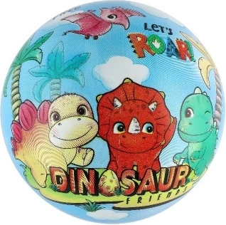 Pestrofarebné ilustrácie dinosaurov robia z lopty atraktívnu hračku, ktorá deti láka k pohybu a spoločnej hre.