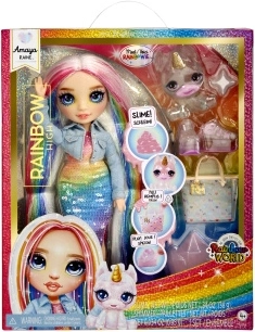 Bábika Rainbow High Amaya kombinuje módny vzhľad a nekonečné možnosti hry. Dlhé dúhové vlasy lákajú k česaniu a stylingu, trblietavé šaty a denimová bundička zažiaria na každej poličke a kĺbové prevedenie umožní dynamické pózy – od catwalk postojov až po šnúru.