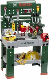 Plne vybavený detský pracovný stôl je vyrábaný v Nemecku v licencii Bosch. Doska stola ponúka rad vzduchových funkcií, zverák a praktické úložné priestory a odkladaciu priehradku. Na zadnej stene kutilského stola a na polici pod pracovnou doskou je priestor pre kvalitné 81-dielne príslušenstvo, z ktorého niektoré možno zavesiť na stenu pomocou praktických háčikov: detský elektrický akumulátorový skrutkovač, plochý a krížový skrutkovač, kľúč, račna, kliešte a pilník, kladivo, píla a meradlo, štvorhran, pravítko a svorka na skrutky. Deti sa naučia obratne zaobchádzať so skrutkami, maticami a skrutkovacími dielmi rôznych veľkostí a tvarov a dbať na bezpečnosť vďaka hračkárskym prilbám a ochranným okuliarom, chráničom sluchu a rukaviciam. Obzvlášť zábavné je samomontážne vozidlo, ktoré možno na pracovisku otáčať a znovu prepracovať. Detská izba sa tak stane dielňou! Stačí si nasadiť prilbu a ochranné okuliare, navliecť rukavice a môžete začať rezať, zatĺkať a skrutkovať. Pracovitým dizajnérom pomáha zverák, ktorý drží lišty určené na upevnenie klincami alebo skrutkami. K dispozícii je aj akumulátorový skrutkovač, ktorý pomocou svetla a zvuku zaskrutkuje všetko, čo chcú malí zostaviť, do niečoho veľkého, a keď je práca hotová, možno všetko rýchlo usporiadať na háčiky a do krabíc.