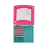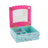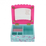 Táto dekoratívna šperkovnica z kvalitného dreva je skvelým riešením na prehľadné uloženie prsteňov, náušníc a drobných pokladov. Ružové veko so sklenenou/transparentnou časťou a vnútorným zrkadielkom uľahčuje rýchly výber doplnkov, zatiaľ čo tyrkysový spodok s jemným kvetinovým vzorom dodá interiéru čarovný akcent.