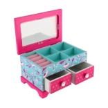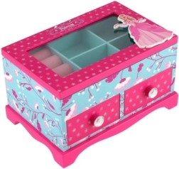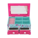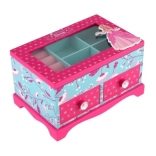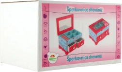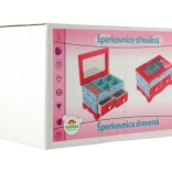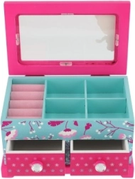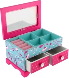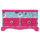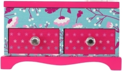 Povrch šperkovnice zdobia jemné kvetinové a vtáčie motívy v kombinácii ružovej a tyrkysovo modrej farby, ktoré krásne doplnia každú detskú izbu. Vďaka pevného drevenému spracovaniu a hladkým úchytkám sa s ňou deťom pohodlne manipuluje. Nie je hračka – vhodné ako dekoračný a úložný predmet.