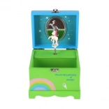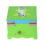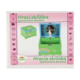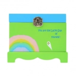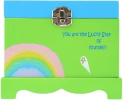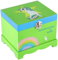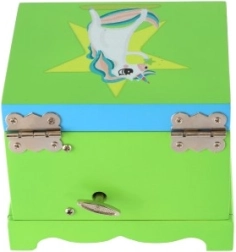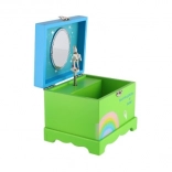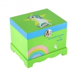 Kúzelná detská šperkovnica z masívneho dreva so zrkadielkom, točiacim sa jednorožcom a naťahovacím hracím strojčekom. Ideálna na uloženie drobných pokladov, šperkov a suvenírov. Veselý dizajn v zelenej farbe s duhou a pozitívnym nápisom rozžiari každú detskú izbu.