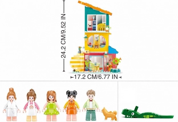 Každé poschodie je svojím spôsobom samostatným svetom – od obývacej izby v červenom presklenom prvom poschodí po útulnú kuchyňu v žltom druhom a relaxačnú izbu plnú kníh na treťom poschodí. Päť figúrok, psík a medvedík dodávajú domu život a umožňujú deťom vytvárať vlastné príbehy a scénky.