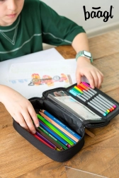 Hľadáte spoľahlivý a elegantný peračník, ktorý udrží všetko prehľadne na svojom mieste? BAAGL Darkness kombinuje minimalistický dizajn s premysleným vnútorným členením. Výklopná prepážka, elastické úchyty a vrecko na zips zaistia poriadok v ceruzkách, perách aj drobných doplnkoch. Transparentné vrecko na rozvrh pomáha lepšie plánovať školský deň.