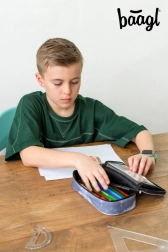 Praktický a odolný školský peračník BAAGL s motívom NASA ponúka prehľadné uloženie písacích potrieb vďaka výklopnej prepážke, vnútornej vrecku na zips a vrecku na rozvrh. Vyrobený z recyklovaného materiálu a osadený kvalitnými zipsami YKK. Bez náplne.