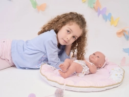 Táto realistická bábika vo veľkosti 40 cm prináša deťom autentický zážitok z hry. Ručná výroba zaisťuje precízne detaily – jemné črty tváre, decentné tieňovanie a pôvabný výraz. Kvalitný vinyl je príjemný na dotyk a odolný na každodenné hranie.