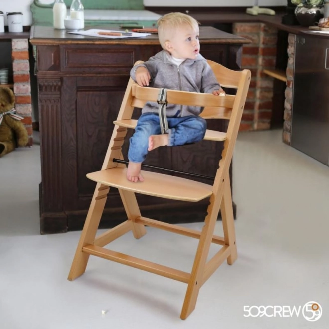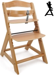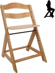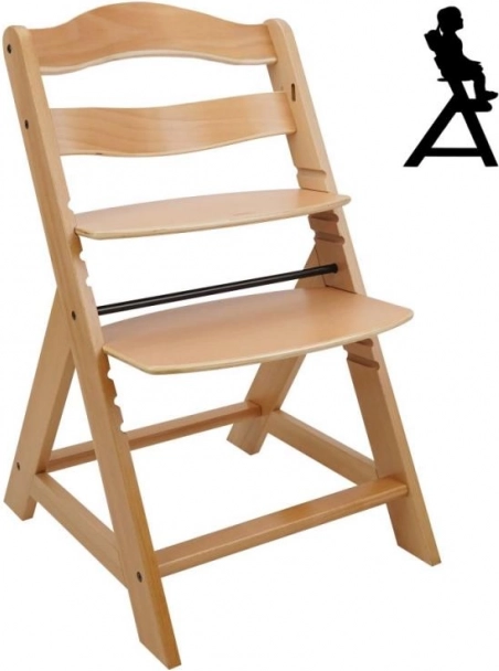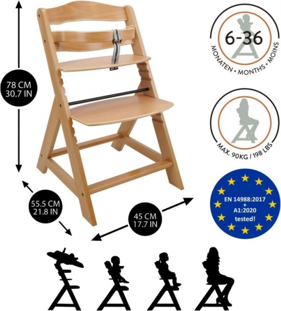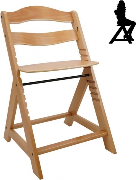 Drevená rastúca jedálenská stolička je navrhnutá pre maximálne pohodlie a bezpečie detí od šiestich mesiacov. Je vybavená viacstupňovým nastavením výšky sedadla a opierky nôh, takže môže slúžiť od raného veku až po dospelosť. Pri dosiahnutí staršieho veku je možné prednú tyč a rozdelenie rozkroku zložiť a stolička môže byť premenená na normálnu stoličku. Je vyrobená z kvalitného nemeckého bukového dreva a poskytuje stabilitu a eleganciu. Jej maximálna nosnosť je až 90 kg.