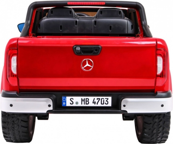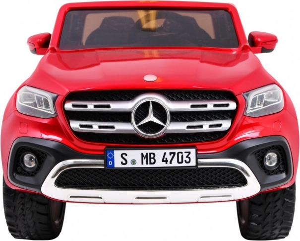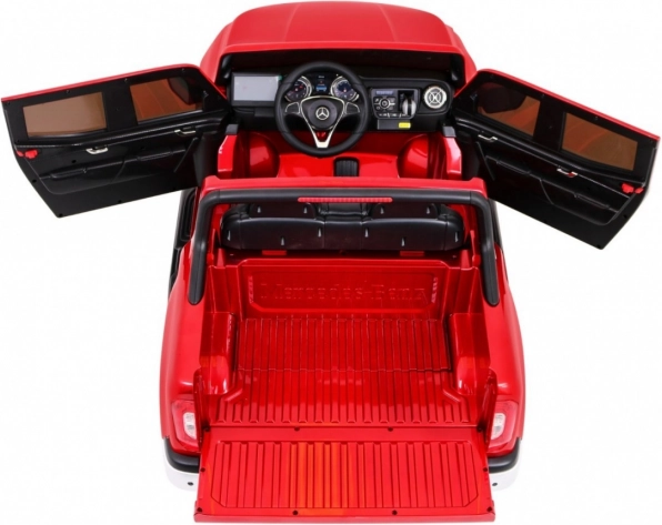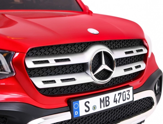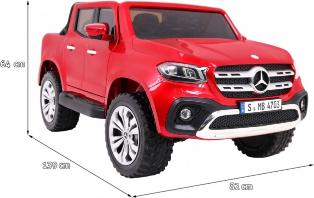 Štýlový detský elektromobil MERCEDES-BENZ X-Class v lakovanej červenej farbe prináša realistický zážitok z jazdy vďaka 4 motorom 45 W, pohonu 2×/4×4, mäkkým EVA kolesám a odpruženiu. Ponúka LED svetlá, MP4 panel, diaľkové ovládanie 2.4 GHz s STOP tlačidlom, pohodlné sedadlo z eko kože a otváracie dvere s blokáciou. Veľký rozmer 139 × 82 × 64 cm a nosnosť až 50 kg robia z tohto pick-upu perfektnú voľbu pre malých vodičov.