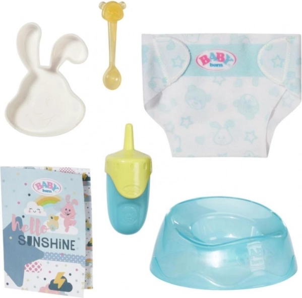 Sada obsahuje fľašu, cumlík, cumlík s páskou, plienky a ďalšie príslušenstvo pre úplnú starostlivosť a hranie.