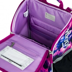 Výklopné otváranie umožní ľahko dosiahnuť na pomôcky priamo z lavice. Vo vnútri je priehľadné vrecko na rozvrh a organizér s gumičkou pre rovnomerné rozloženie hmotnosti.