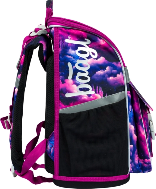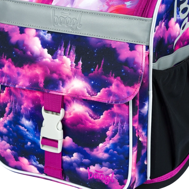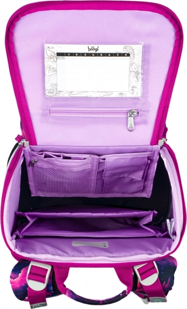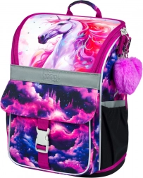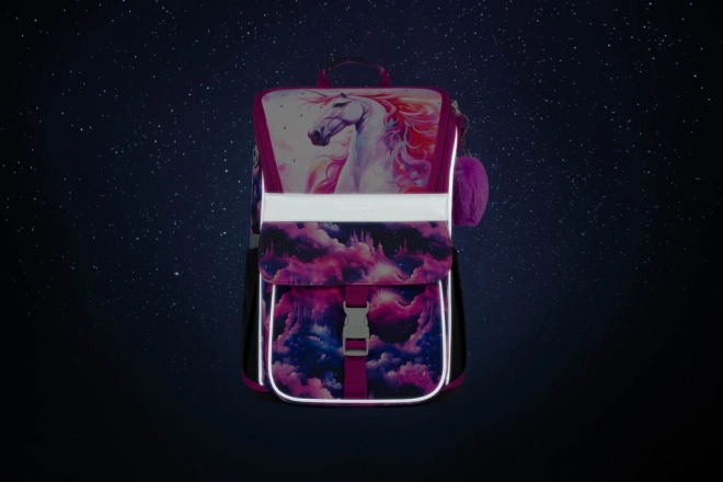 Štýlový motív Jednorožec Kráľovstvo v ružovo-fialových tónoch deti nadchne. Reflexné prvky zvyšujú bezpečnosť a pevná konštrukcia drží tvar počas celého školského dňa.