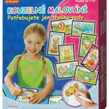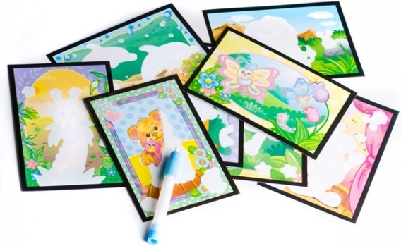 Postup: Otvorte kúzelnú ceruzku, naplňte ju vodou a uzavrite. Pretierajte príslušné časti obrázkov, kým sa nevyfarbia. Pre menšie deti možno použiť aj obyčajný štetec a pohárik s vodou.