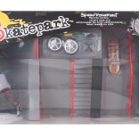 Miniatúrne nastavenie skateparku s rampami, schodmi a zábradliami pre autentický zážitok.