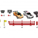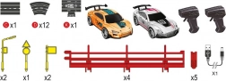 V balení nájdete všetko potrebné na okamžité pretekanie: 2 pretekárske špeciály, 2 ručné ovládače a praktické príslušenstvo. Vďaka kompaktnému rozmeru 90 × 65 cm sa autodráha zmestí na stôl aj do detskej izby.
