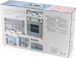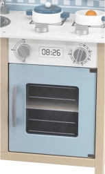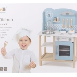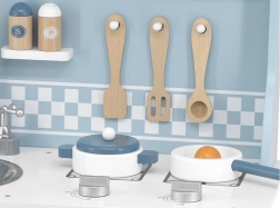 Súčasťou balenia je bohaté príslušenstvo: hrniec s pokrievkou, panvica s vajíčkom, lyžica, dierovaná obracačka, stierka a soľnička s koreničkou. Funkčné detaily, ako pohyblivé ručičky hodín a otočné ovládacie gombíky s klikaním, dodávajú hre realizmus a učia deti základom organizácie pri varení aj pečení.