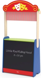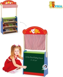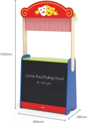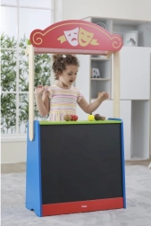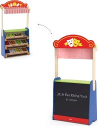 Táto kvalitná drevená hračka kombinuje domáce bábkové divadlo a detský obchodík v jednom. Deti môžu striedať scény a role behom chvíľky – keď sa hrá rozprávka, stiahnu oponu a na čiernu tabuľu napíšu názov predstavenia; pri hre na obchod potom názov obchodíka, ceny či akcie.