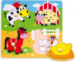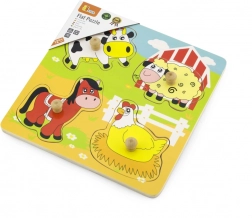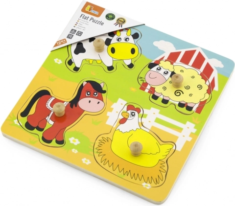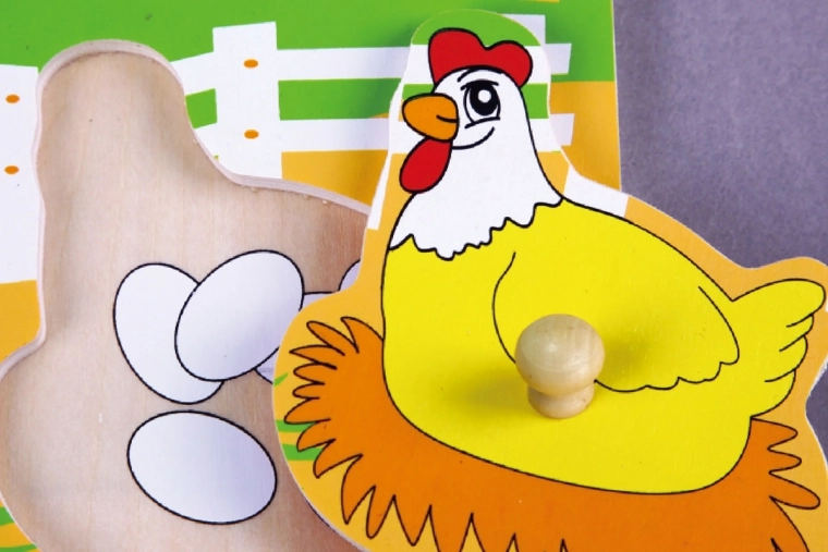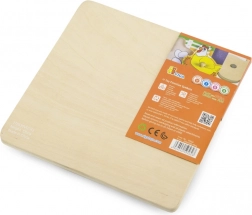 Odolná drevená doska s približnými rozmermi 22 × 22 cm je bohato ilustrovaná farmárskym motívom, ktorý deti motivuje k ďalšiemu hraniu a rozvoju slovnej zásoby (napr. krava, ovečka, kôň, sliepka). Hračka je vhodná od 12 mesiacov a vďaka kompaktným rozmerom sa ľahko upratuje aj prenáša.