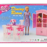 Súčasťou je veľký stôl, štyri stoličky, príborník a kompletné stolovacie doplnky. Všetko je vyrobené z odolného plastu a prispôsobené na jednoduchú manipuláciu detskými rukami.