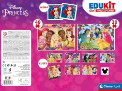 Zábavný súbor hier 4 v 1 s motívmi Disney Princezien prináša dve puzzle, pexeso a 6 plastových kociek v jednej praktickej sade. Ideálne na rozvoj jemnej motoriky, logiky a pamäti, navyše v prenosnej krabici s uškom na jednoduché nosenie.