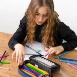 Peračník je vybavený výklopnou vnútornou prepážkou a vreckom na rozvrh, čo umožňuje efektívnu organizáciu školských potrieb.