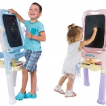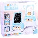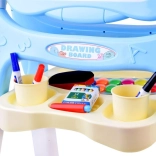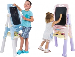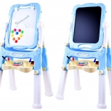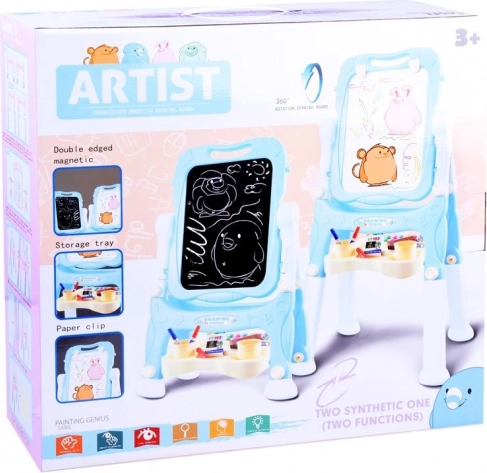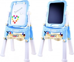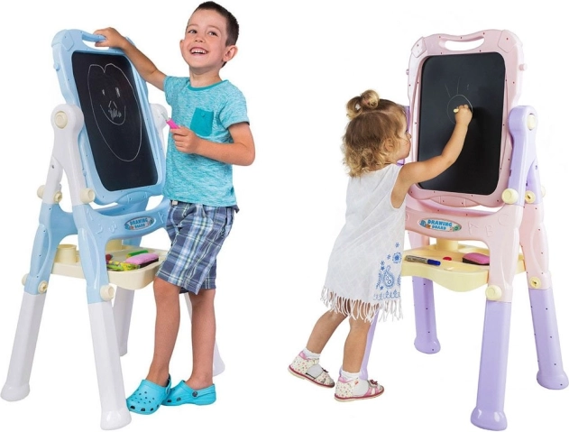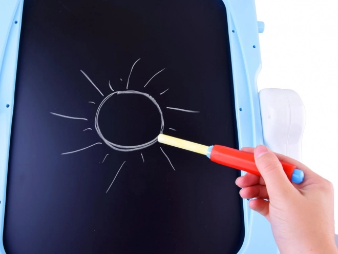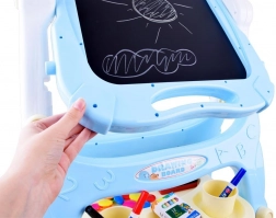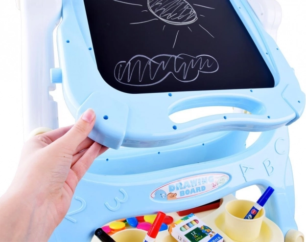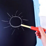 Táto stabilná maliarska tabuľa s pastelovo modrým rámom podporuje kreativitu aj učenie. Jedna strana je magnetická pre suché stierateľné popisovače a pripínanie magnetov či papierov, druhá strana je klasická čierna na kreslenie farebnými kriedami. Vďaka praktickej poličke, pohárikom a držiakom budete mať všetky potreby vždy po ruke.