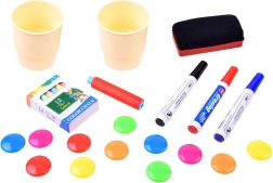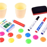 Súčasťou balenia sú magnety, suché stierateľné popisovače s hubkou, farebné kriedy, držiak na kriedu a polička na potreby.