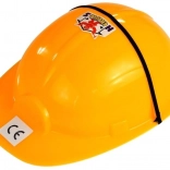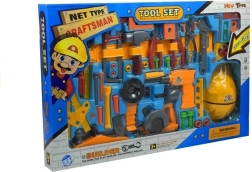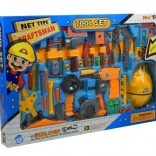 Set zahŕňa poháňané prvky (vŕtačku, brúsku a kotúčovú pílu) na 2× AA 1,5 V batérie, rovnako ako ručné nástroje a spojovací materiál na stavanie a skrutkovanie. Praktický pracovný pás udrží náradie vždy po ruke a podporí samostatnosť a organizáciu práce.